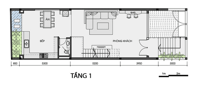 - Thiết kế nhà có tầng hầm 5×20 với phòng khách rộng rãi, thoải mái kết hợp với quầy bar thuận tiện cho việc thư giãn thoải mái.