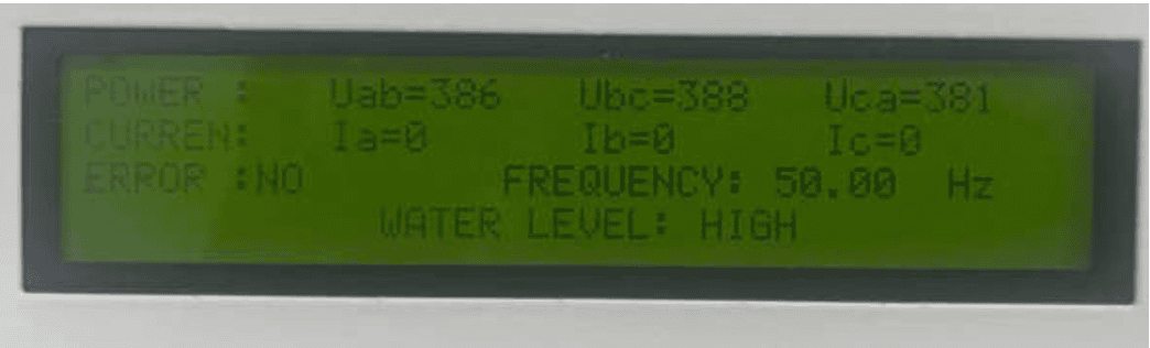 Hiển thị điện áp và dòng điện | Điện áp pha Dòng điện mỗi pha khi bơm hoạt động |