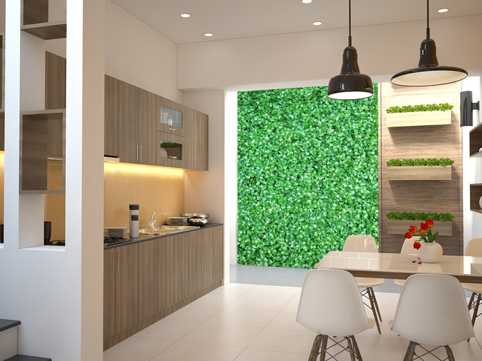 Khu vực nhà bếp bày trí đơn giản, lấy tông màu trắng làm chủ đạo rất sang trọng. Điểm nhấn ở đây chính là dùng gạch ốp tường có họa tiết hoa văn độc đáo. Hệ thống tủ bếp âm tường tiết kiệm không gian nhà bếp đáng kể.